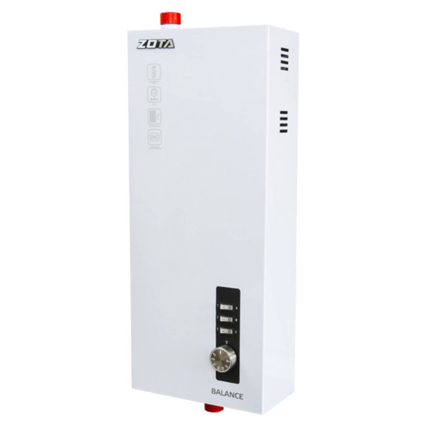 Одноконтурный котел Zota (Зота) Balance V2 -4,5 работает от электричества с возможностью подключения к трехфазной или однофазной сети. Надежные блоки ТЭН обеспечивают долговечность, а компактная и оптимизированная конструкция легко устанавливается на стену. Также упрощено обслуживание и ремонт.